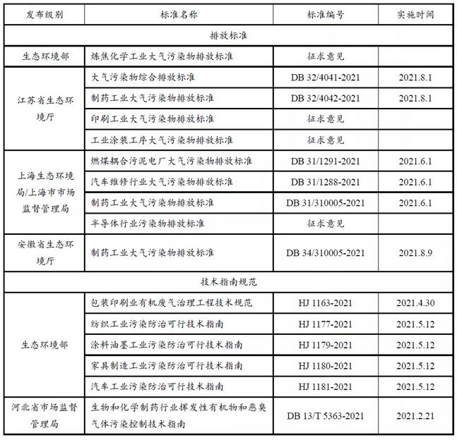 在標(biāo)準(zhǔn)規(guī)范方面,國家和地方管理部門、行業(yè)協(xié)會陸續(xù)發(fā)布實(shí)施相關(guān)文件。生態(tài)環(huán)境部和國家市場監(jiān)督管理總局發(fā)布《煉焦化學(xué)工業(yè)大氣污染物排放標(biāo)準(zhǔn)》征求意見。江蘇省發(fā)布(包括修訂)了《大氣污染物綜合排放標(biāo)準(zhǔn)》(DB 32/4041-2021)《制藥工業(yè)大氣污染物排放標(biāo)準(zhǔn)》(DB 32/4042-2021)。上海市發(fā)布《燃煤耦合污泥電廠大氣污染物排放標(biāo)準(zhǔn)》(DB 31/1291-2021)《汽車維修行業(yè)大氣污染物排放標(biāo)準(zhǔn)》(DB 31/1288-2021)《制藥工業(yè)大氣污染物排放標(biāo)準(zhǔn)》(DB 31/310005-2021)。上海市、江蘇省、浙江省和安徽省發(fā)布的首個(gè)長三角一體化標(biāo)準(zhǔn)《制藥工業(yè)大氣污染物排放標(biāo)準(zhǔn)》(DB 31/310005-2021/ DB 34/310005-2021),以深化長三角區(qū)域?qū)M2.5和O3的協(xié)同控制。中國環(huán)境保護(hù)產(chǎn)業(yè)協(xié)會發(fā)布《旋轉(zhuǎn)式沸石吸附濃縮裝置技術(shù)要求》(T/CAEPI 31-2021)《固定床蜂窩狀活性炭吸附濃縮裝置技術(shù)要求》(T/CAEPI 34-2021)兩項(xiàng)團(tuán)體標(biāo)準(zhǔn)。